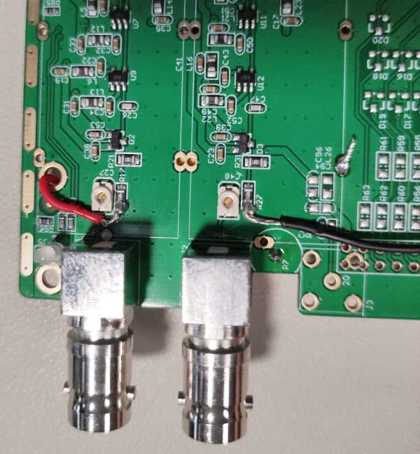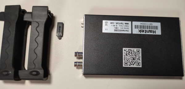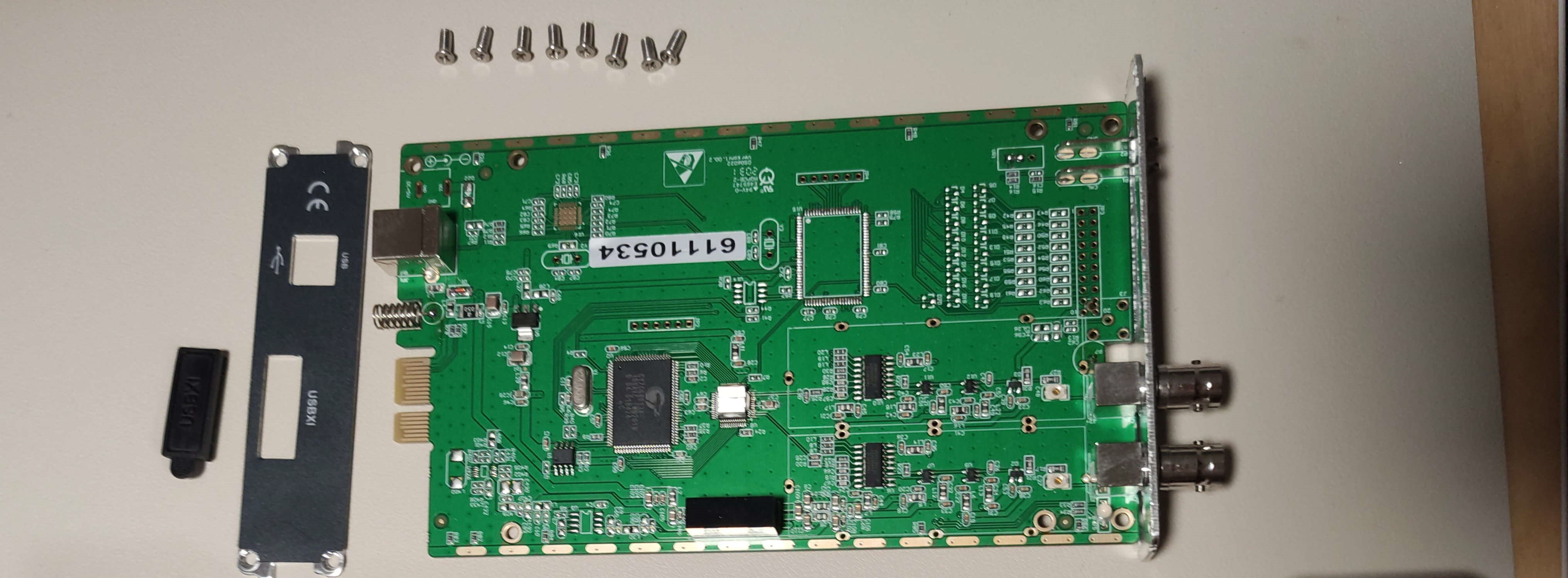 Taking apart the Hantek Scope is pretty straight forward. You just need to loosen 4 Philips heads screws on the side of the channel inputs and the board can be pulled from the case. Inside the scope is primarily a USB2 Controller and an EEPROM. Besides that also some empty spots exits, where components of higher specs would be placed. Remarkably there is even a heat sink on a not-identfifyable component. Furthermore, the grounding is greatly implemented by using the sides of the PCB to ground everything to the aluminum case. In a nutshell a great internal structure for such a generous price.