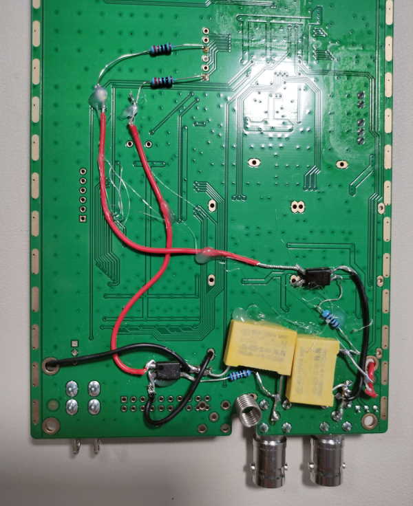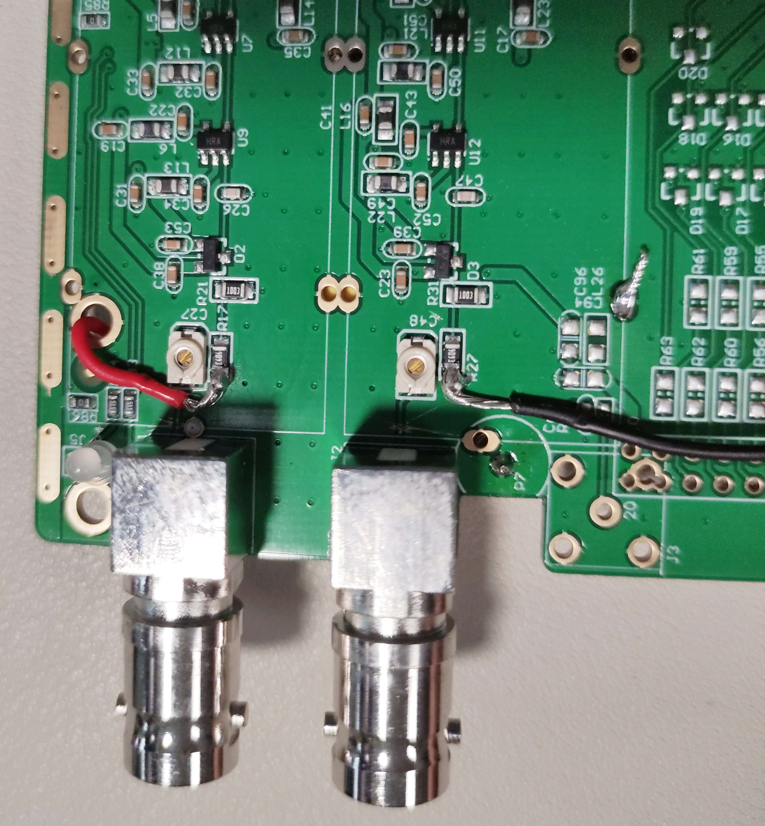 The Capacitors need to be connected in series between the channel signal output and the onboard resistor R17 on the first and resistor R27 on the second channel. Also, the PhotoMOS ICs need to be connected in series to the Cap while Pin 3 is directly connected to the resistors and pin 4 is connected to the channel input alongside with the new 1 kΩ resistors. Pin 2 of both PhotoMOS need to be grounded.